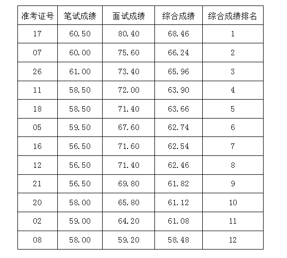 根據(jù)《大龍窩索道公司技術(shù)員招聘公告》,按筆試成績與面試成績6:4權(quán)重計算綜合成績,現(xiàn)公告如下: