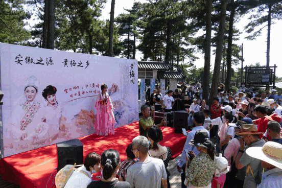 在游客服務(wù)中心及大龍窩索道上站廣場(chǎng),多場(chǎng)黃梅戲連臺(tái)演出,臺(tái)上演員與臺(tái)下游客頻繁互動(dòng),婉轉(zhuǎn)悠揚(yáng)的黃梅鄉(xiāng)音在山谷間蕩漾,廣大游客沉醉其中,真切感受到了“樹上的鳥兒成雙對(duì),綠水青山帶笑顏”的意韻。