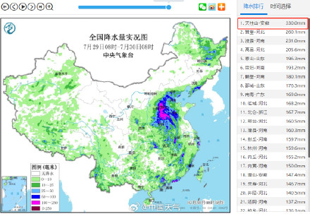 受“杜蘇芮”殘留云系影響,安徽天柱山昨天夜間開始出現(xiàn)猛烈降雨,29日08時(shí)-30日08時(shí)的24小時(shí)降水量達(dá)330毫米,達(dá)特大暴雨級別,是過去24小時(shí)里全國降雨最強(qiáng)的國家站,也是該站點(diǎn)自1949年來單日降水量第一。