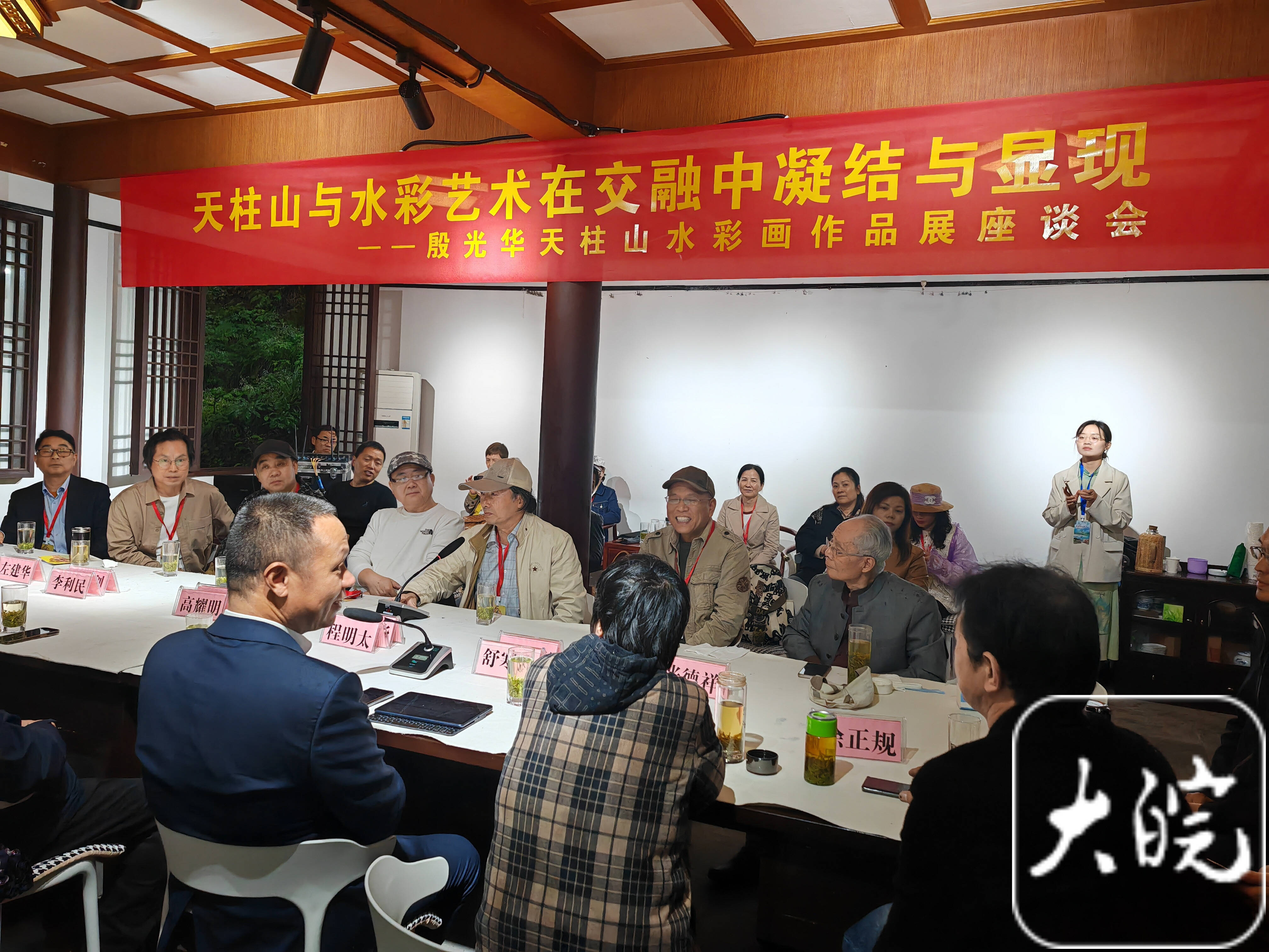 開幕式上,天柱山管委會為殷光華頒發(fā)“天柱山駐山畫家”和“天柱山榮譽山民”證書,并舉行殷光華天柱山繪畫工作室揭牌儀式。殷光華向天柱山管委會和地質(zhì)公園博物館分別贈送一件作品,并獲贈收藏證書。4日下午,就“天柱山與水彩藝術(shù)在交融中凝結(jié)與顯現(xiàn)”舉行座談。
