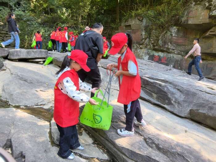 山谷流泉景區(qū)里,景區(qū)志愿者為招募而來的小學生志愿者穿上紅色小馬甲,戴上小紅帽,送上國旗貼紙和小國旗,并帶上火鉗、方便袋等小工具在景區(qū)拾撿垃圾,參與古箏學習、弈棋、朗誦古詩等豐富多彩的互動志愿活動,一抹抹“中國紅”流動在景區(qū)里,大家都感受到奉獻的快樂,一粒?!皭邸钡姆N子悄然播種在小志愿者的心田。與此同時,志愿者們還在山谷流泉文化園、天柱山地質(zhì)公園博物館開展免費講解、宣傳天柱山歷史文化、天柱山故事等服務。