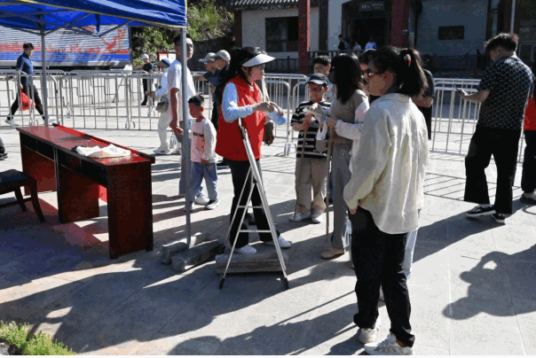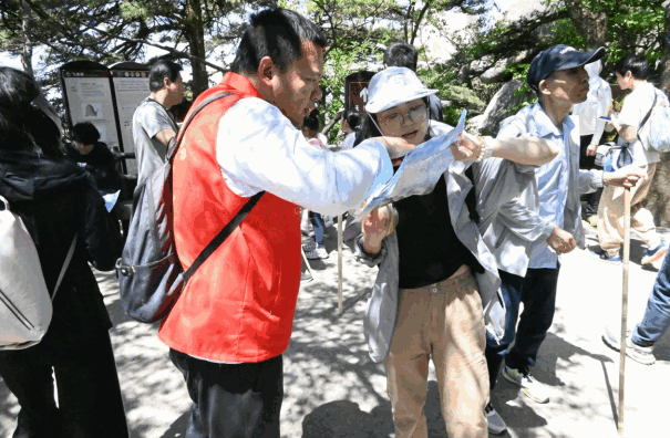五一小長假,天柱山各級機(jī)構(gòu)主動上山,志愿者在景區(qū)各個地方為游客排憂解難。在大龍窩索道游客中心,游客數(shù)量眾多,人頭攢動。他們穿著志愿者服務(wù)的小馬褂,戴著紅色志愿者的服務(wù)帽,面對游客提出的各種問題,他們仔細(xì)傾聽,耐心解釋,始終保持微笑服務(wù)。遇見行動不便和年紀(jì)偏大的游客,他們一邊提醒游客注意,一邊主動上前攙扶。